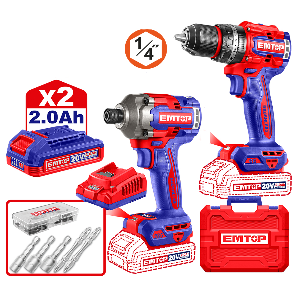 Voltage:20V With 1Pcs Cordless Impact Driver(ECIRL20281) With 1Pcs Compact Brushless Cordless Impact Drill(ECIDL206681)